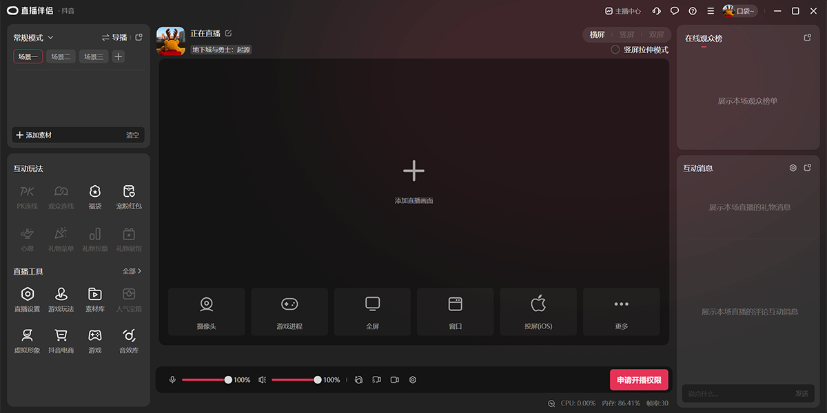 抖音直播伴侣是一款专业的抖音直播辅助工具,为你提供高性能、高画质的专业开播能力,拥有专业的大屏直播能力,互动公屏、实时榜单、美颜特效、绿幕抠像、导播模式等等。用户只需要在抖音上获得…
